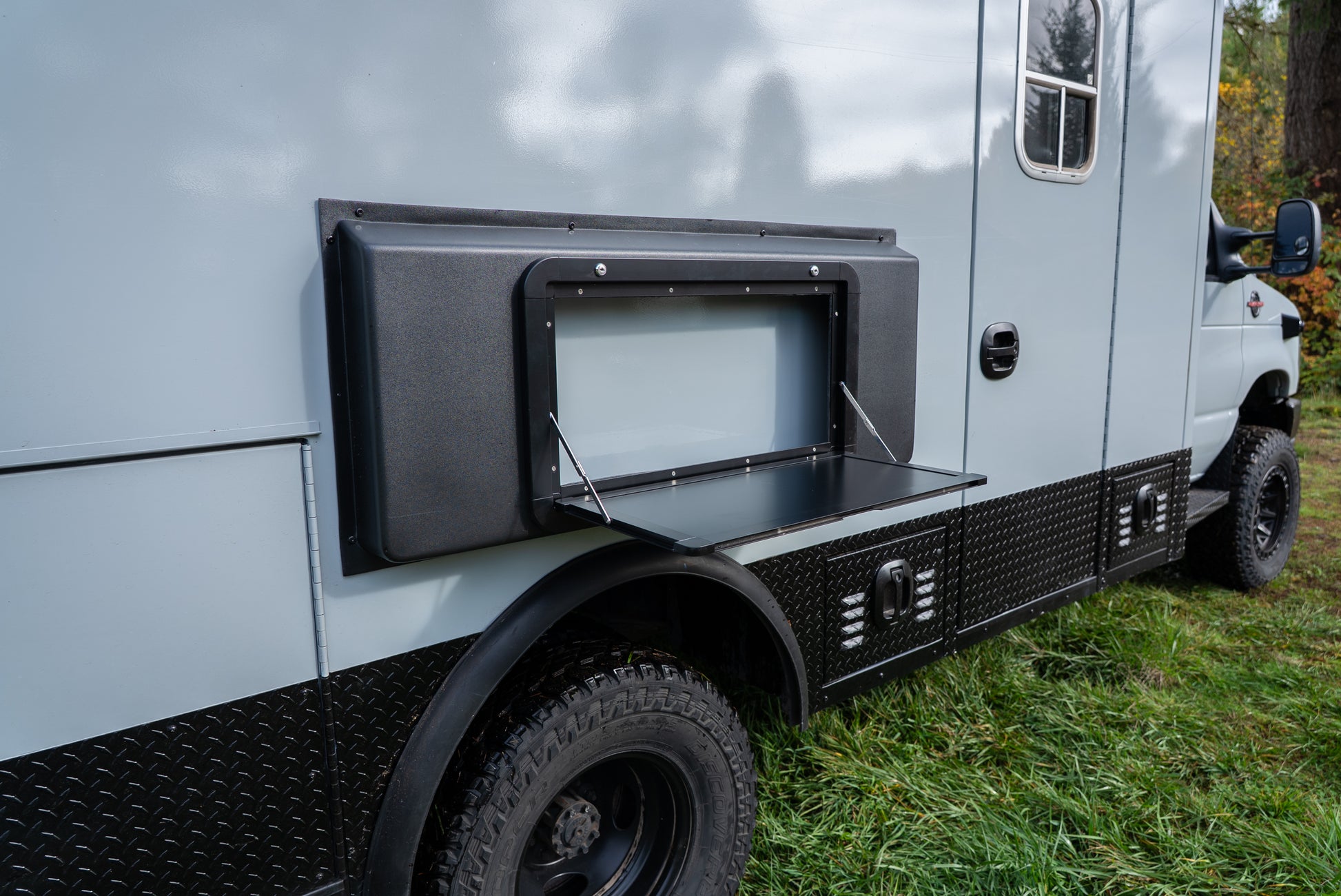 This Universal Exterior Cooking & Storage Flare transforms the side of your van, trailer, or overland vehicle into a full outdoor station. The integrated drop-down door creates a stable platform for compact camp stoves, tools, or gear, while the internal compartment adds over 1.6 cubic feet of protected storage.